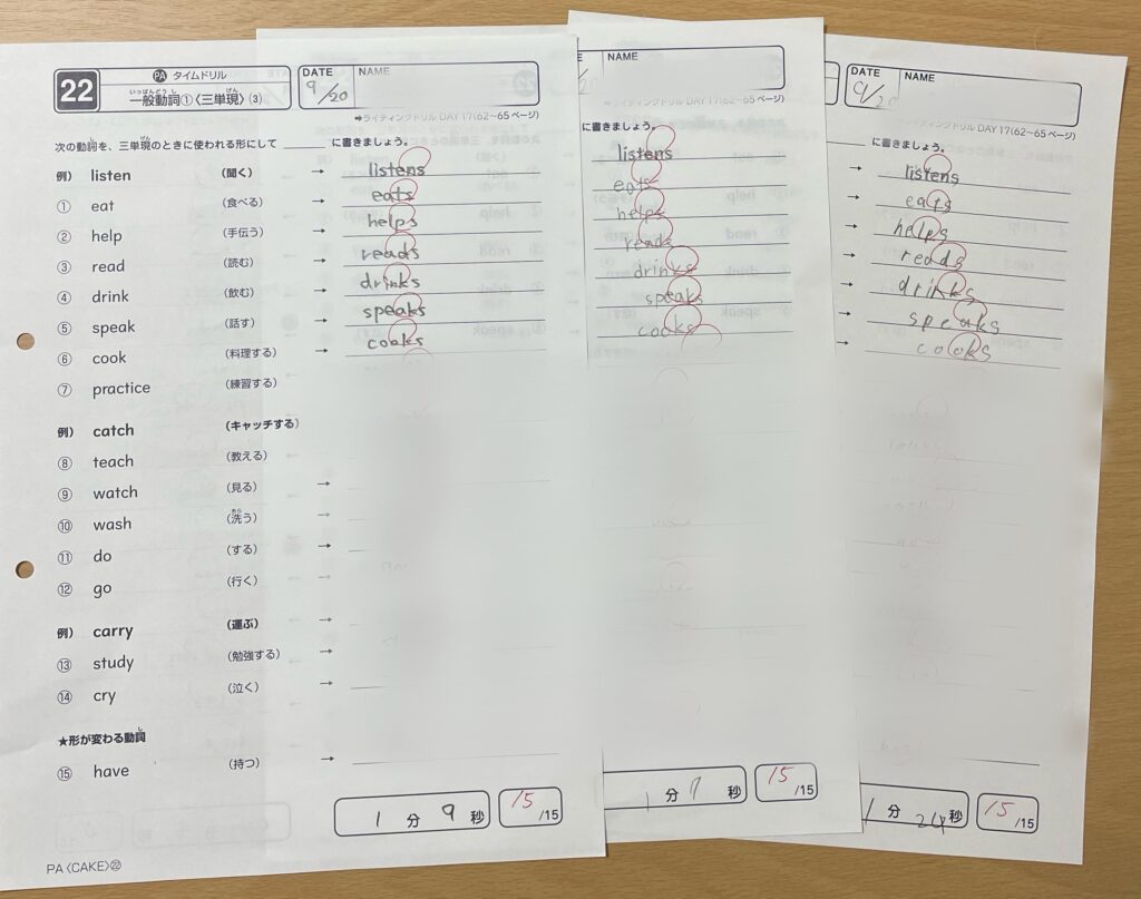 授業は毎回「タイムドリル」からスタート。時間を測って集中することで、正確さとスピードの両方を意識して練習しています。今回も全員が見事に満点!