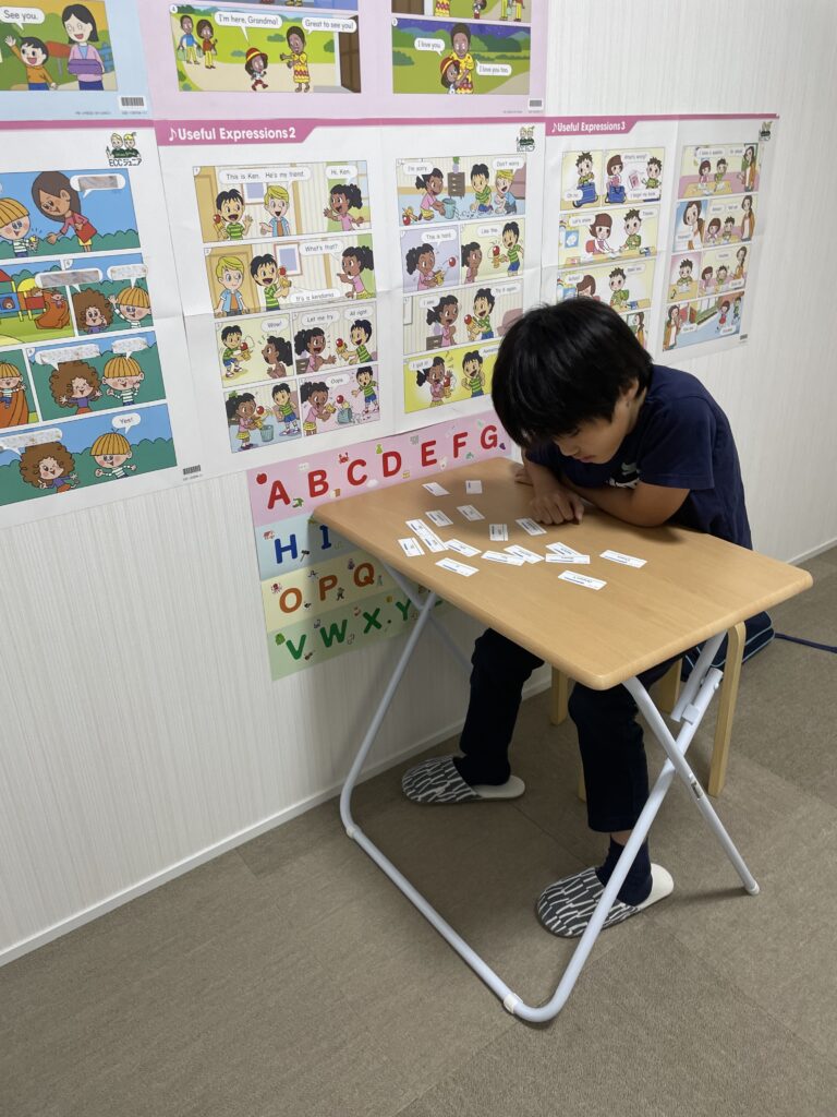 日本語と英語では語順が異なるため、カードを並べ替えて文を完成させ、最後は声に出して読み上げて復習。