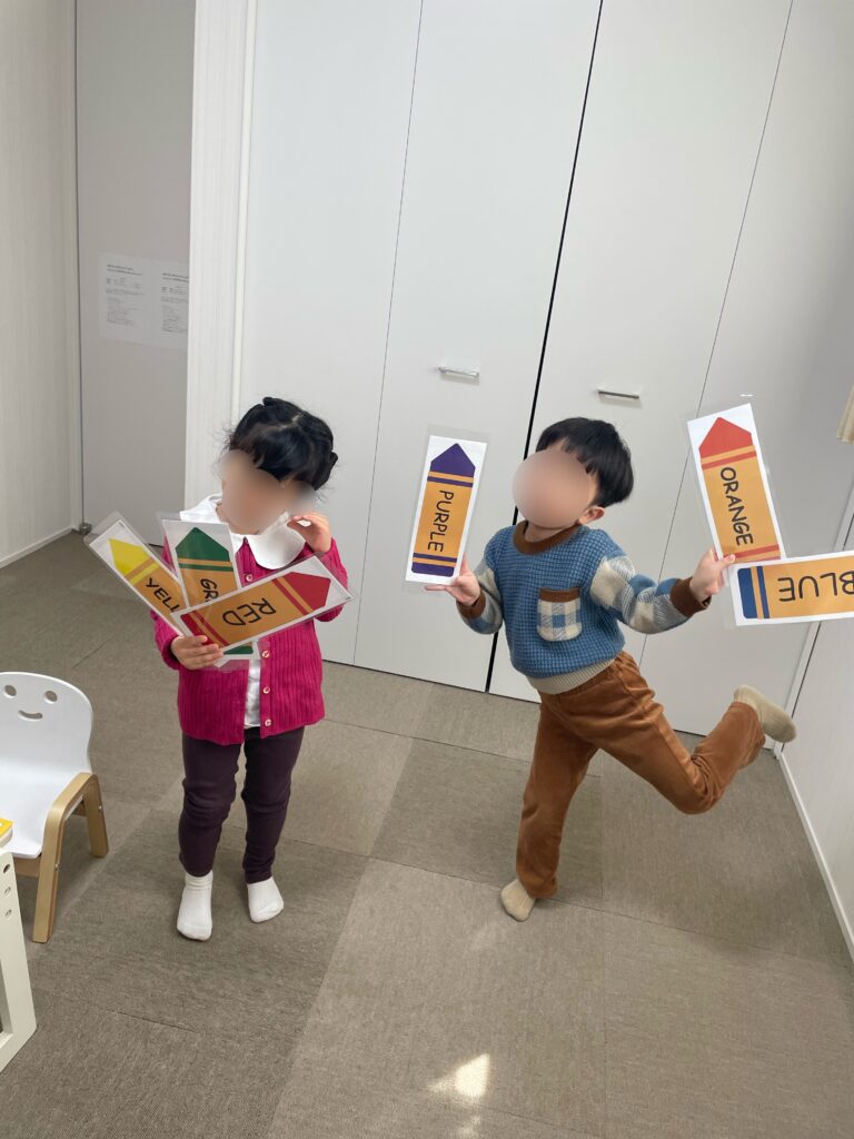 アルファベット学習では、指を使って空中に文字を書く「エアライティング」にも挑戦しました。塗り絵の時間には、「Red ,Blue!」と色を英語で表現する場面も。